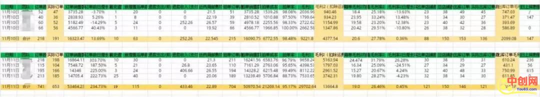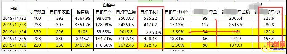 下面的数据①是11月10日的数据,当天项目总毛利是9221.8元,因为虾皮是发到国外,有额外的运费,扣除运费后的利润是4377.54元。