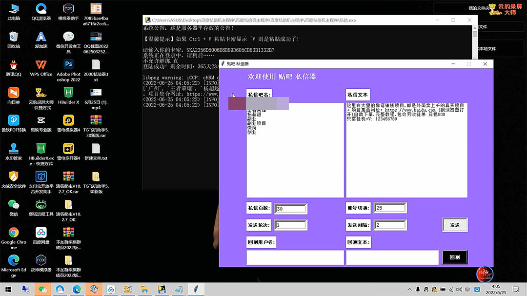 【贴吧私信机】:贴吧私信机操作需要自备贴吧CK小号,没有的可以去购买,一个贴吧CK号大概价格在1块左右,每天可以发送大约20-30条私信,具体建议自测,目前调试测试下来对于贴吧CK小号的损耗还行,不过过量发布也导致贴吧CK小号被风控的风险,这个得事先告知你们,建议多号操作,控制每天的私信发送量,不要单个贴吧CK小号往死里怼私信!
