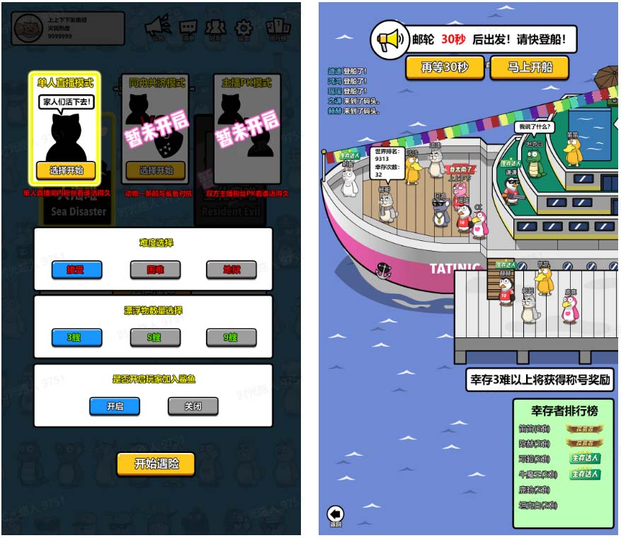 主播通过选择不同的灾难,开启观众的求生之旅。目前过审设计制作中的子玩法有《大海难》、《外星侵略》、《生化灾难》。《大海难》玩法是观众在邮轮沉没之后,选择漂浮物对抗鲨鱼及各种怪物生存到最后。《外星侵略》玩法是观众在规定时间内躲避外星人攻击活到最后即可活动胜利。《生化灾难》玩法是观众选择不同的战车躲避生化怪物的追击和清除道路阻碍逃出升天即可生存下来。当前已开发《大海难》玩法。